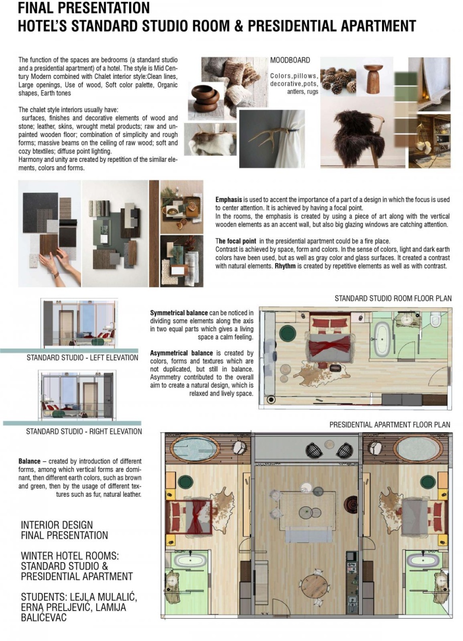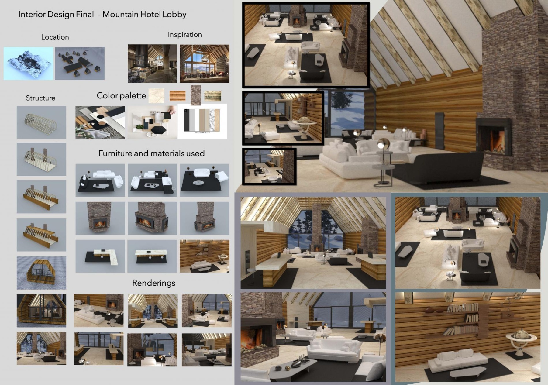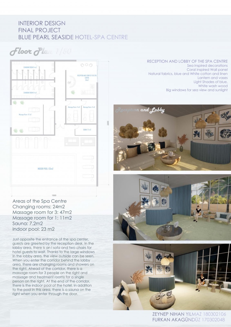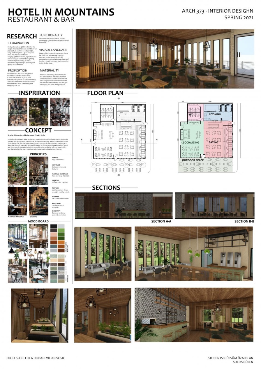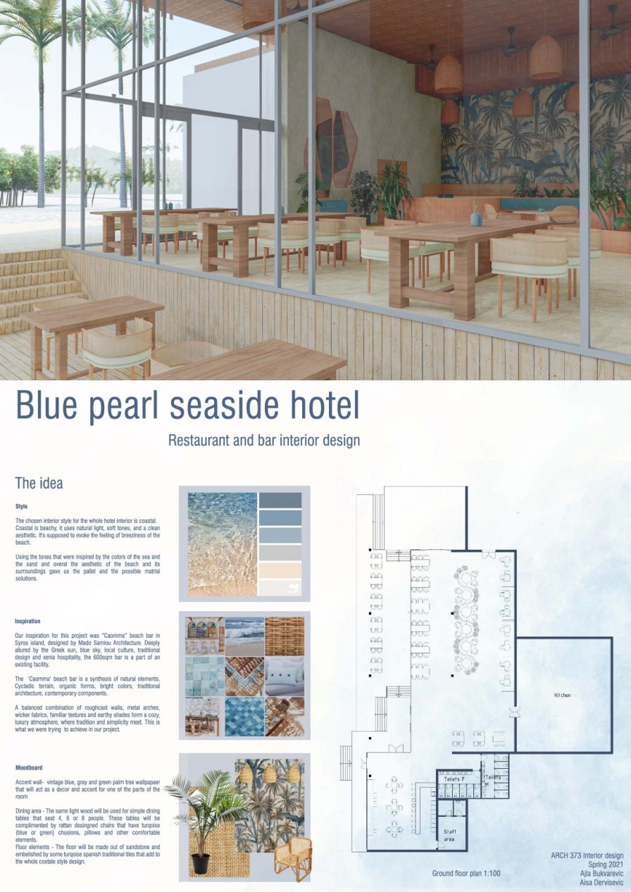 The brief for the Spring semester 2021 course was to create the interior space for a upscale hotel, one mountain and one in seaside setting. The students understood the development of the different spaces accommodating specific needs and finely creating beautiful interior spaces. They combined the theoretical and practical concepts finding best solutions for the specific areas of the given spaces.