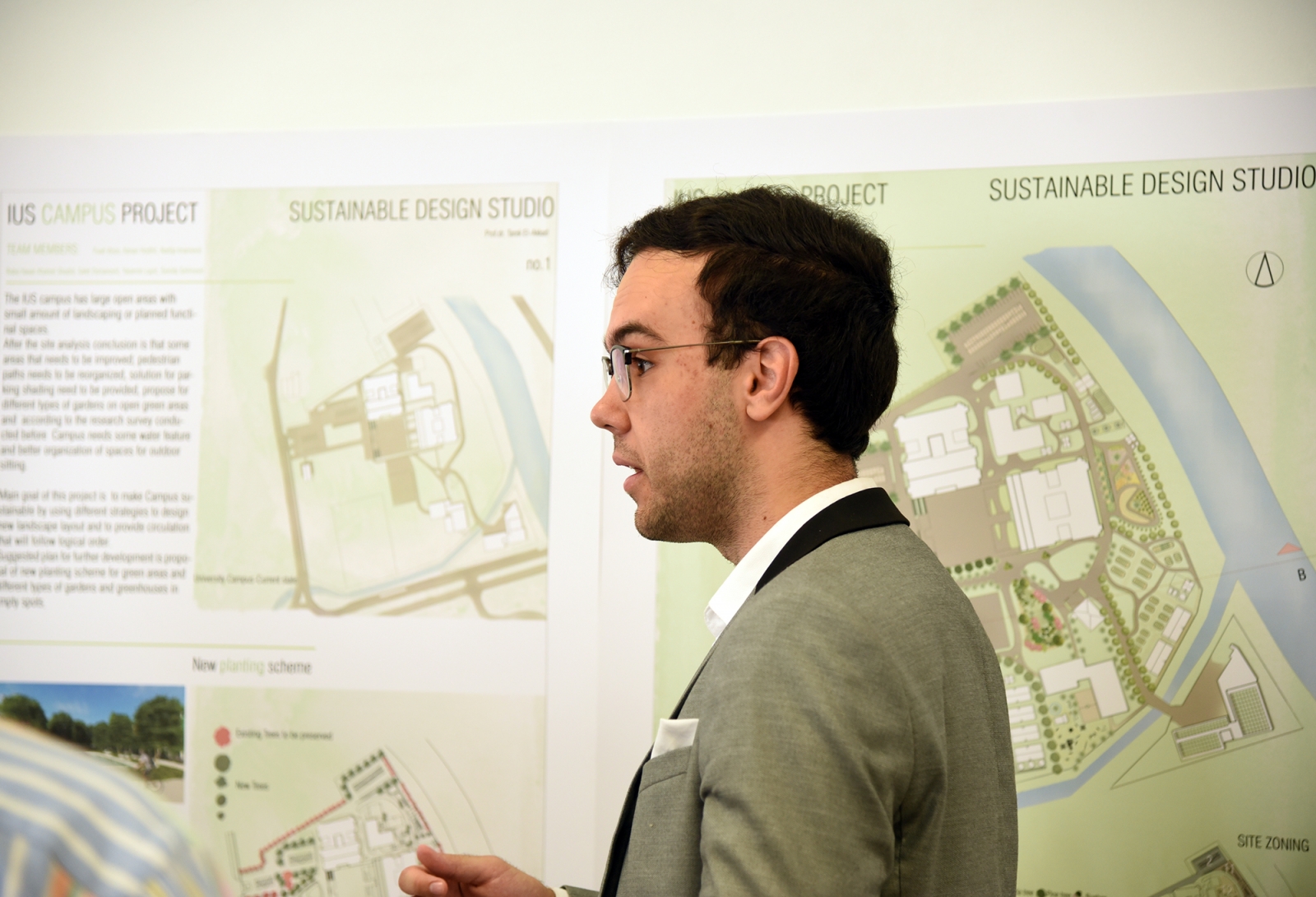Students of IUS Architecture Department, under the supervision of their professor Prof.Dr. Tarek El-Akkad, have organized an exhibition „Sustainable Design Studio: IUS Campus Project“. The main goal of the exhibition was to use the existing IUS campus area and make it more sustainable by using different strategies to design new landscape layout and provide circulation that will follow logical order. The suggested plan is actually a proposal of new planting schemes for green areas and different types of gardens and greenhouses in empty spots. Student of the second cycle of Architecture and Scholarship Assistant Kenan Hodžić presented the project to the attendees and explained the benefits of fostering environmentally-friendly elements at the IUS campus.